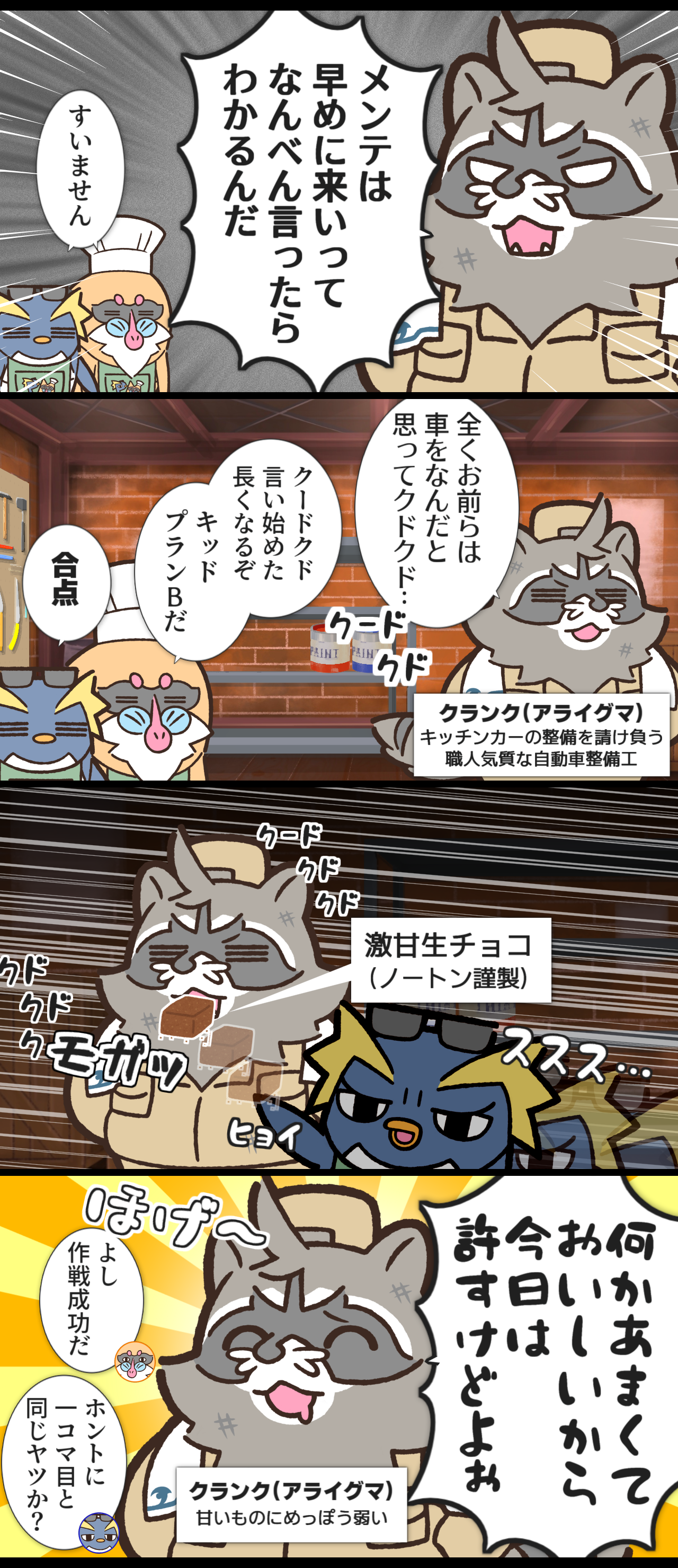 クランク(アライグマ)キッチンカーの整備を担当した整備工。酒飲みで甘党な職人気質。あまい…☆おいしい…☆