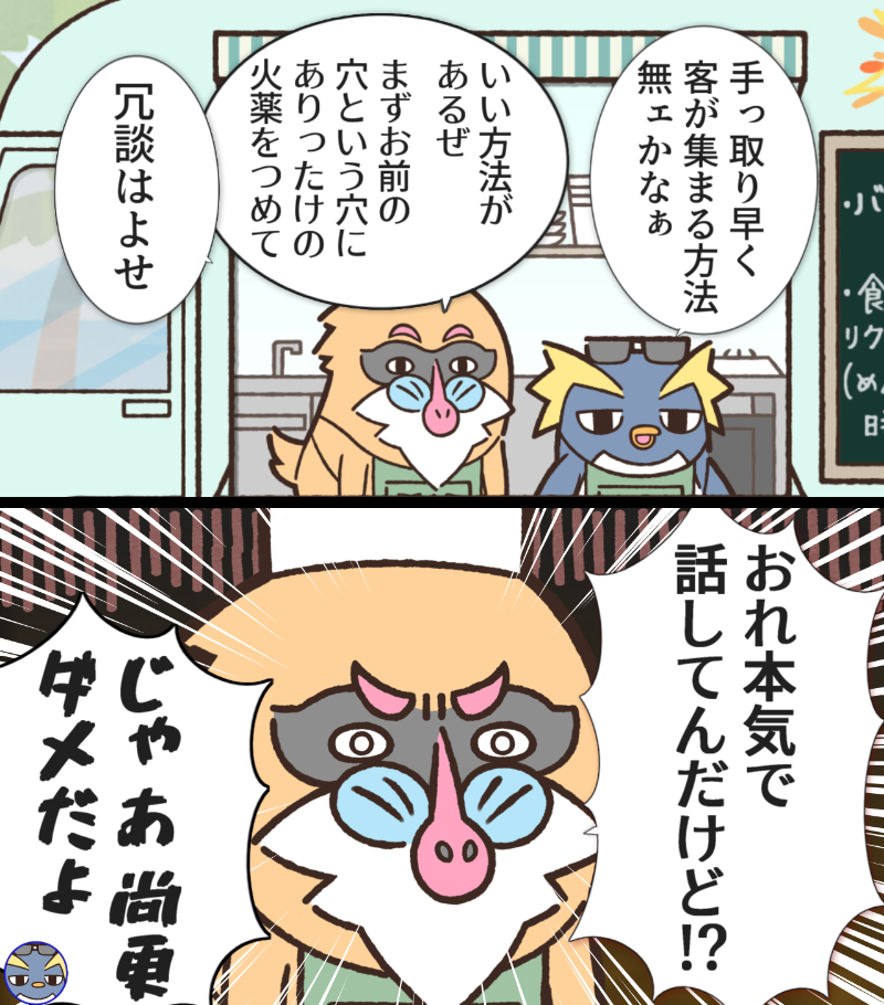 ノートン(マンドリル)キッチンカー「ピーキーモンスターズ」のキッチン担当。小器用な陰キャ。だめか…爆薬の注文キャンセルしないと。