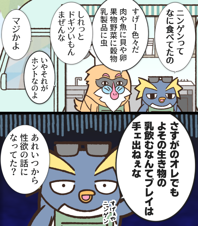 ノートン(マンドリル)キッチンカー「ピーキーモンスターズ」のキッチン担当。小器用な陰キャ。そこでわくな。